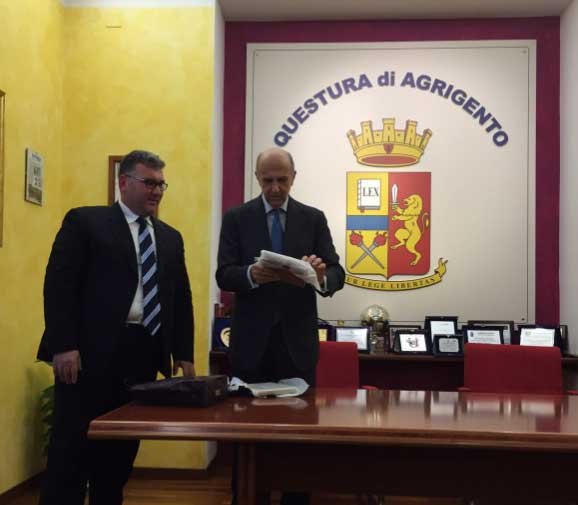 Ieri alle ore 16,00 circa il Capo della Polizia Prefetto Alessandro PANSA si è recato presso la Sala “San Michele” all’interno del palazzo che ospita la Questura di Agrigento dove, alla presenza del Questore Mario Finocchiaro, ha voluto salutare i Funzionari e le Organizzazioni Sindacali più rappresentative della Polizia di Stato. Una visita gradita che ha visto Alfonso IMBRO’, Segretario Generale Provinciale del Movimento dei Poliziotti Democratici e Riformisti (M.P.) portavoce anche della Uil- Polizia, donare due meravigliose opere in ceramica raffiguranti il Tempio della Concordia e la stupenda Scala dei Turchi quale ricordo dei luoghi più significativi della nostra Provincia.