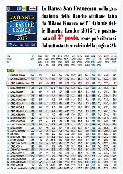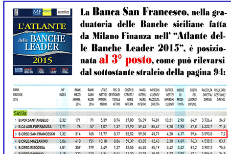 Anche quest’anno MF ( Milano Finanza) ha predisposto l’Atlante delle Banche leader 2015. La Banca San Francesco di Canicattì si trova a celebrare un importante risultato, evidenziato dalla graduatoria pubblicata, che raccoglie alcuni dati inerenti l’sitituto di credito canicattinese.