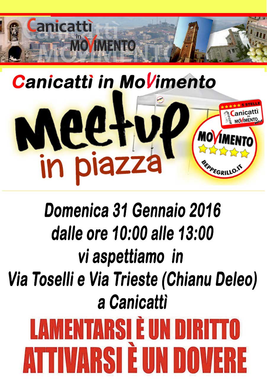 I rappresentanti di “Canicattì in Movimento”, gruppo locale del M5S, oggi, Domenica 31 Gennaio 2016 in Via Toselli e Via Trieste (Chianu Deleo) a Canicattì saranno presenti con un gazebo informativo “invitiamo tutti i cittadini, stanchi del vecchio sistema dei partiti, a darci il loro contributo di idee affinché la Canicattì di domani possa essere un luogo degno dove crescere i propri figli.