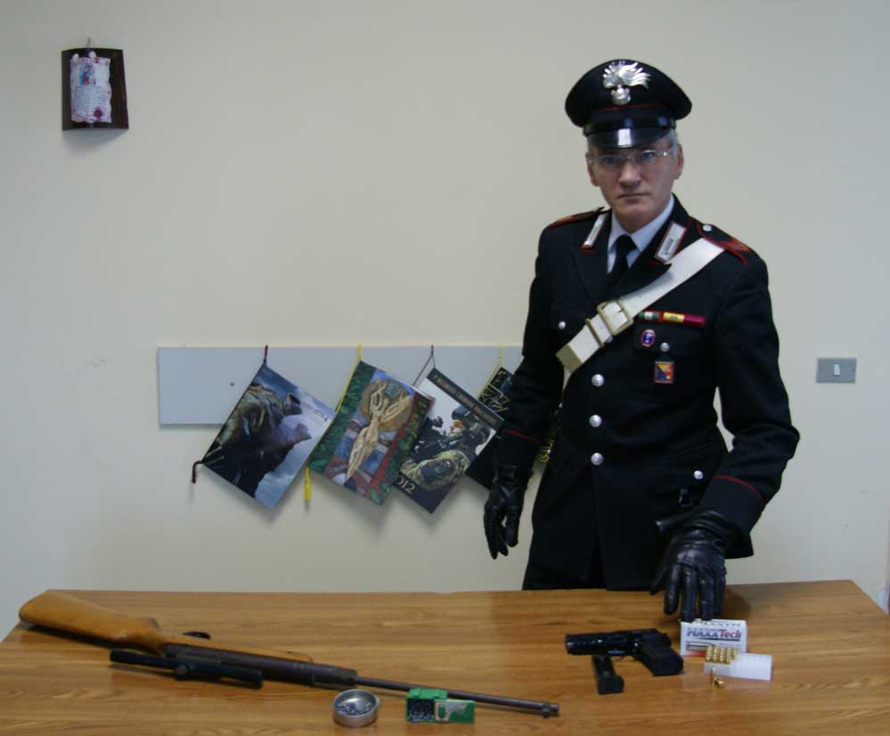 Nel corso delle perquisizioni eseguite sono state rinvenute n. 1 pistola cal. 9 di fabbricazione estera, n. 1 carabina aria compressa, n. 25 cartucce cal. 9×19 e numero imprecisato di piombini cal. 4,5 mm.