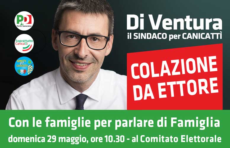 Domenica 29 maggio, alle ore 10.30 presso il Comitato Elettorale di via Piave 67 (di fronte negozio Natì), il candidato sindaco Ettore Di Ventura terrà un incontro elettorale che vedrà protagoniste le famiglie canicattinesi.
