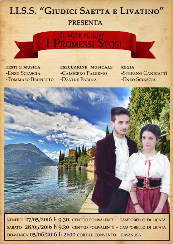 In scena, stasera (Domenica 29 maggio), a Ravanusa, presso il cortile del Convento, “I Promessi Sposi”, alle ore 21, a Ravanusa, a cura del Liceo. “Facciamo teatro…..tutti scena” questo il titolo del progetto scolastico che i docenti Luisa Vinci, Maria Assunta Sammartino e Carmelo Corbo dell’ Istituto “Giudici Saetta e Livatino”, diretto dalla dirigente Adriana Letizia Mandracchia, portano a termine in questi giorni insieme ad un numeroso gruppo di studenti e con la preziosa presenza del regista Enzo Sciascia e del suo collaboratore Stefano Canicattì. Personaggi ed interpreti: don Abbondio (Luigi Sciandrone), Don Rodrigo (Calogero Montana), i Bravi (Matteo Puccio e Giuseppe Sicurelli), Agnese (Agnese Farruggio), la Monaca di Monza (Maria Argento), la Badessa (Teresa Argento), le Monache (Alisea Cocita, Eliana Gambino, Maria Chiara Greco, Rosalba Lentini), il Perpetuo (Rosario Callari), l’Azzeccagarbugli (Angelo di Maida), l’Innominato (Carmelo Corbo), Griso (Damian Cani), Alessandro Manzoni (Calogero Farruggio), le narratrici (Antonella D’Anna e Ilaria Messinese). I testi teatrali sono stati scritti da Enzo Sciascia e le musiche da Tommaso Brunetta. Esecuzioni musicali di Calogero Palermo e Davide Farina, coreografie di Desy Vivacqua. Le scenografie sono di Giovanni Romano e curate da Chiara Falsone, Alida Avarello, Laura Sanfilippo, Antonino Gambino, Cassandra Tasca, Simona La Rocca, Miriana Casuccio, Mariangela Capobianco, Chiara Capizzi, Vittorio Romano. Assistenti di scena Miriam Aronica e Sonia Gangarossa. Tecnico della grafica Calogero Di Maida.