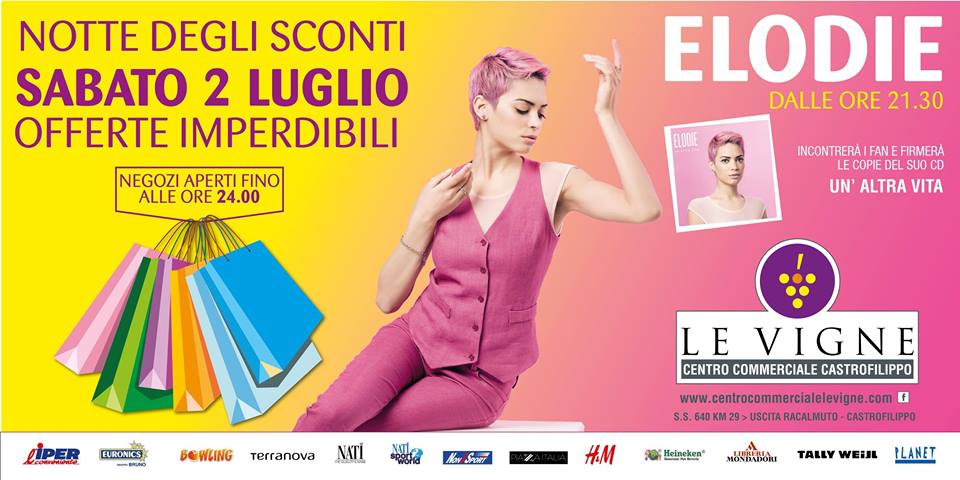 La direzione del centro commerciale “Le Vigne” a seguito della concomitanza con la partita Italia-Germania di euro 2016 , ha spostato l’appuntamento con Elodie a a mercoledì 6 luglio a partire dalle ore 18.00.
