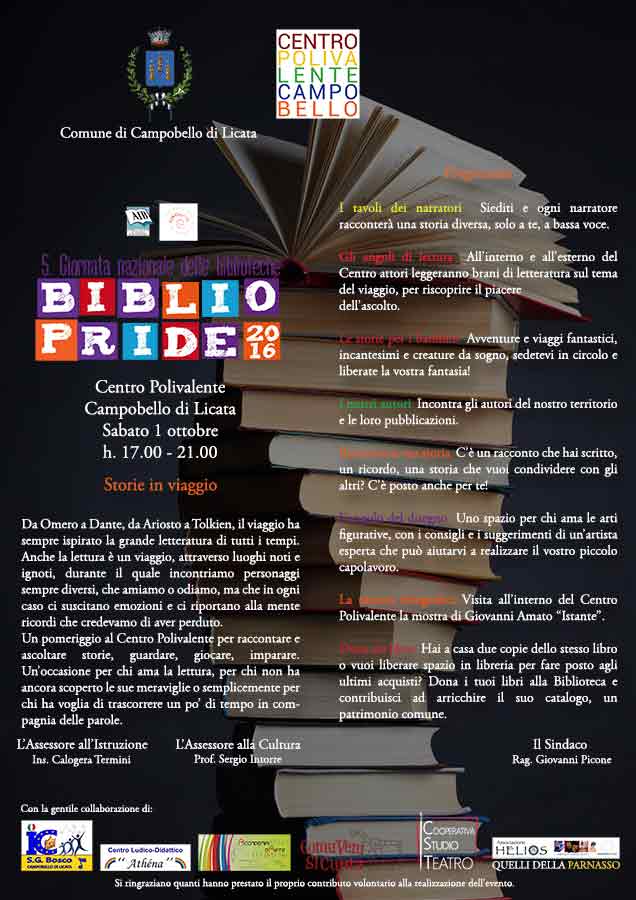 La Biblioteca del Centro Polivalente di Campobello di Licata (AG) aderisce al BiblioPride 2016 – V Giornata Nazionale delle Biblioteche. L’iniziativa viene organizzata a livello nazionale dall’AIB (Associazione Italiana Biblioteche) e vede coinvolte biblioteche di tutta Italia che vi aderiscono.