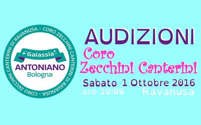 Campobello – Ravanusa – Si svolgeranno Sabato 1 Ottobre 2016, dalle 10:00 alle 12:00 presso la Sala Teoria e Solfeggio del Centro musicale e d’arte ACAMS, le audizioni e selezioni per entrare a far parte del Coro Zecchini Canterini 2017, coro riconosciuto dall’Antoniano di Bologna che fa parte della Galassia dei Cori.