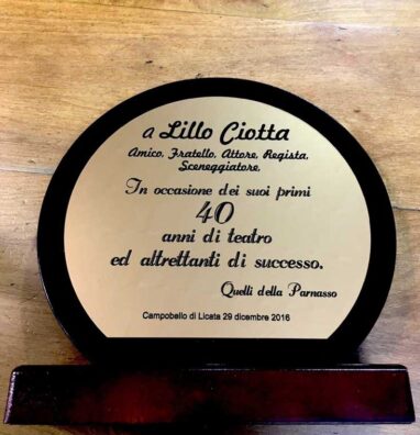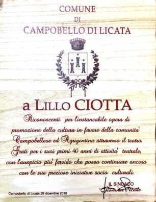 A festeggiare Lillo, oltre alla sua compagnia, a Tano Avanzato e al suo pubblico affezionato, ha voluto partecipare il sindaco Giovanni Picone (anche lui, a suo tempo, attore della Parnasso) che ha consegnato una particolare targa riportante la seguente dedica: “A Lillo Ciotta, riconoscenti per l’instancabile opera di promozione della cultura in favore della comunità Campobellese ed Agrigentina attraverso il teatro. Grati per i suoi 40 anni di attività teatrale, con l’auspicio più fervido che possa continuare ancora con le sue preziose iniziative socio culturali”.