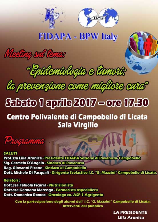 Sabato 1° Aprile p.v. alle ore 17.30 presso la Sala Virgilio del Centro Polivalente per i Servizi Socio-culturali di Campobello, la Sezione FIDAPA di Ravanusa e Campobello, sotto la Presidenza della Prof.ssa Lilla Aronica, terrà un incontro sul tema “Epidemiologia e tumori: la prevenzione come migliore cura”. Dopo i saluti della Presidente, dei Sindaci dei due comuni di riferimento e del Dott. Michele Di Pasquali, Dirigente Scolastico dell’I. C. “G. Mazzini” di Campobello, relazioneranno la Dott.ssa Fabiola Ficarra, nutrizionista, la Dott.ssa Germana Marengo, farmacista ospedaliera e il Dott. Domenico Romeo, oncologo co. ASP 1 Agrigento.