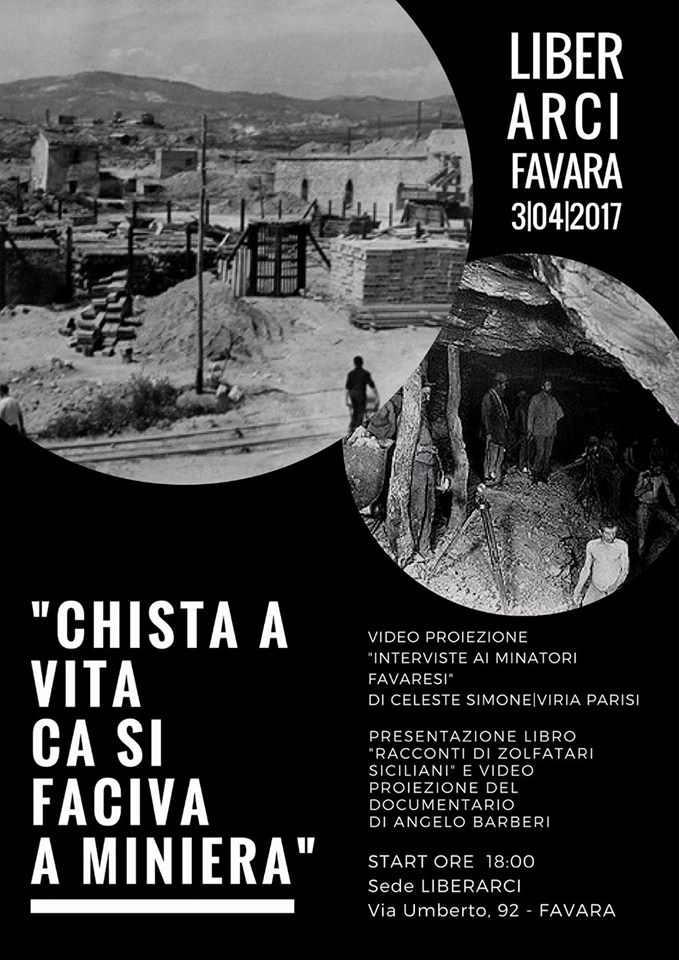 Si terrà lunedì 3 aprile, presso la sede del circolo culturale LiberArci, sita in via Umberto n 90, alle ore 18.00, la proiezione del documentario sui minatori siciliani realizzato dal prof. Angelo Barbieri. Da questo lavoro di ricerca è nato il libro dal titolo “Chista vita ca si faciva a miniera” (Ed, Sicilia Punto L) che raccoglie tutte queste testimonianze . Infatti, l’autore tra il 1987 e il 1988 fece delle interviste a vecchi zolfatari in giro per la Sicilia, tra cui Favara. I favaresi che all’epoca si prestarono a queste interviste furono: Sicilia Calogero, Russello Francesco, Di Gloria Salvatore, Moscato Paolo e Spitale Vincenzo. L’autore ritornò a Favara nel 2009 per fare delle riprese sia nel paese che nelle miniere Ciavolotta e Lucia al fine di montare tutto questo lavoro e dare uno sfogo visivo alle dichiarazioni rilasciate dai minatori citati.