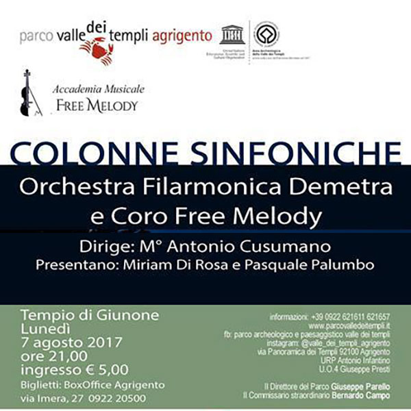 Il Parco Archeologico della Valle dei Templi, Lunedì 7 Agosto, presenta il concerto dell’Orchestra Filarmonica Demetra e il Coro Free Melody, con ingresso a pagamento di Euro 5,00 dalla biglietteria del Tempio di Giunone alle ore 21,00.