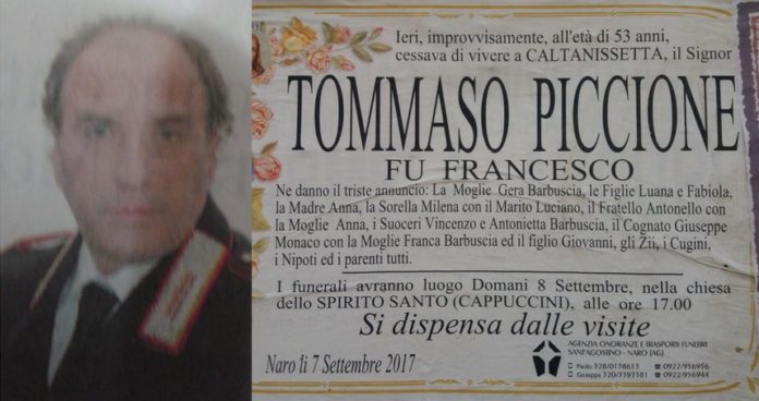 Ha accusato un malore mentre era in servizio ed è morto poco dopo probabilmente per un aneurisma. Tommaso Piccione, maresciallo dei carabinieri, del nucleo investigativo, 53 anni, di origini pugliesi e residente a Naro ha detto a un collega di sentirsi male e poco dopo si è accasciato al suolo. Inutile la corsa all’ospedale Sant’Elia, per lui non c’è stato più nulla da fare. Il Maresciallo Piccione lascia la moglie e due figlie.