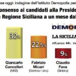 Nella graduatoria della notorietà si conferma il primato di Musumeci: lo conoscono 8 siciliani su 10. In recupero Cancelleri, che incassa dieci punti in un mese: dal 58 al 68%. Ancor più significativa la crescita di notorietà per Micari: +14%, pur restando ultimo con appena 4 elettori su 10 che hanno sentito parlare di lui. Stabile Fava, sopra il 60% di notorietà. Immutata l’hit parade della fiducia. Appaiati Cancelleri (40%), Musumeci (39%) e Micari (37%); Fava più indietro: si fida di lui il 29% di chi lo conosce. Primi trend sulle liste per l’Ars: M5S prima forza “virtuale” a Sala d’Ercole (sfiora il 30%); sul podio Forza Italia e Pd, per Demopolis entrambi “a doppia cifra”; supererebbe, “con estrema tranquillità”, la soglia per l’accesso all’Ars anche la lista di Musumeci, #DiventeràBellissima.