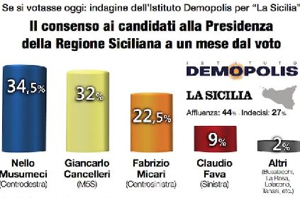 Nello Musumeci sorpassa Giancarlo Cancelleri. A 30 giorni dal primo sondaggio Demopolis-La Sicilia (e a un mese dalle Regionali), nel testa a testa s’inverte l’ordine: in vantaggio il candidato del centrodestra con il 34,5%, tallonato dal grillino (32%); a settembre erano rispettivamente al 34 e al 35%. Ma la partita resta più che mai aperta. Fabrizio Micari non decolla: è terzo con il 22,5%, con appena mezzo punto di incremento in quattro settimane; nello stesso periodo Fava sale dal 6 al 9%.