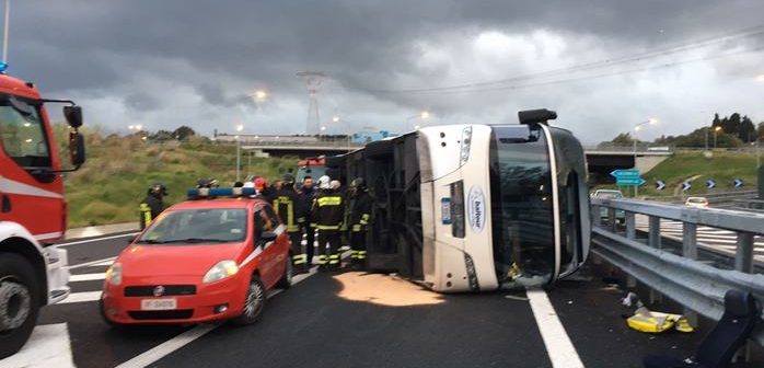 Quindici persone sono rimaste ferite, tra cui due donne in modo grave anche se non sono in pericolo di vita,in seguito al ribaltamento del pullman su cui viaggiavano. L’incidente è avvenuto nei pressi dello svincolo di San Giovanni dell’A2 autostrada del Mediterraneo.