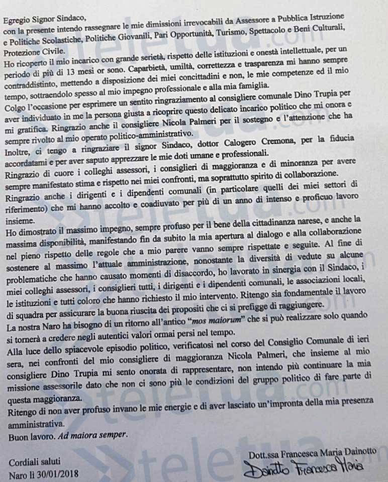 Si è dimessa questa mattina l’assessore Francesca Maria Dainotto dopo il terremoto politico di ieri sera in aula a Palazzo San Francesco.