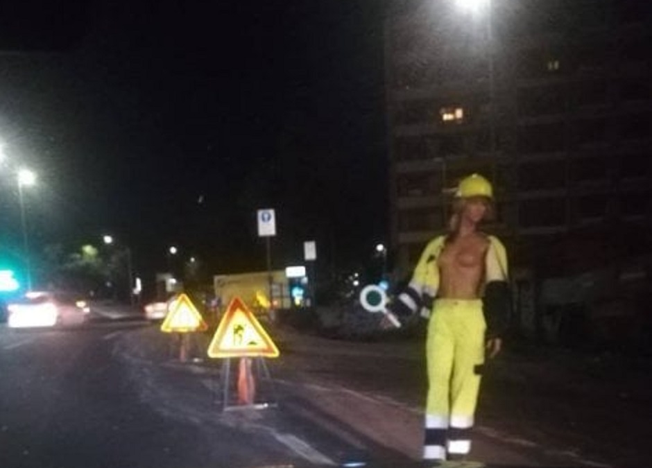 Eco come si fa a far decelerare gli automobilisti nei pressi del cantiere. Qualcuno ha messo un manichino a seno nudo per segnalare i lavori in corso sulla circonvallazione di Catania, con tanto di cappellino e tuta catarifrangente.