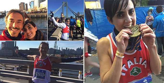 [04:34, 5/11/2018]: Percorso duro, mille ponti, mille saliscendi che ti tagliano le gambe, curve e curve… ma si va, spediti e rispettando la tabella di marcia, tenendo un passo in linea con allenamento e test eseguiti durante la lunga preparazione. Fino al trentesimo km, quando Aurora inizia ad avere un risentimento all’anca, sempre crescente, sempre più presente. Proviamo ad usare un roller che conviene messo a disposizione da un team di runner, sembra funzionare, per pochi minuti però. Lottiamo fino al trentacinquesimo, quando decidiamo di rivolgerci all’assistenza medica dell’organizzazione. Troviamo una giovane terapista, spieghiamo alla maniera de noantri il problema è chiediamo del ghiaccio (io anche una sostituzione con qualcosa di più giovane e funzionale… ma non si può…?) Lei capisce e preferisce praticare un massaggio, ripartiamo. Due km come nuova, poi pian pianino torna a farsi sentire, insistente, il dolorino, poi dolore. Ma ormai siamo in Central Park, la gente ci incita, italiani wake up, sveglia, ma è una battaglia. Proseguiamo, ultime miglia, prendiamo tutto quello che il pubblico offre, biscotti, frutta, un cinque (se non lo diamo ci restano male) e sali e acqua, ai ristori… ultima curva svoltiamo da Columbus al tratto finale in Central Park, quattrocento metri lunghi, interminabili. Poi le luci, i fotografi, le urla delle
