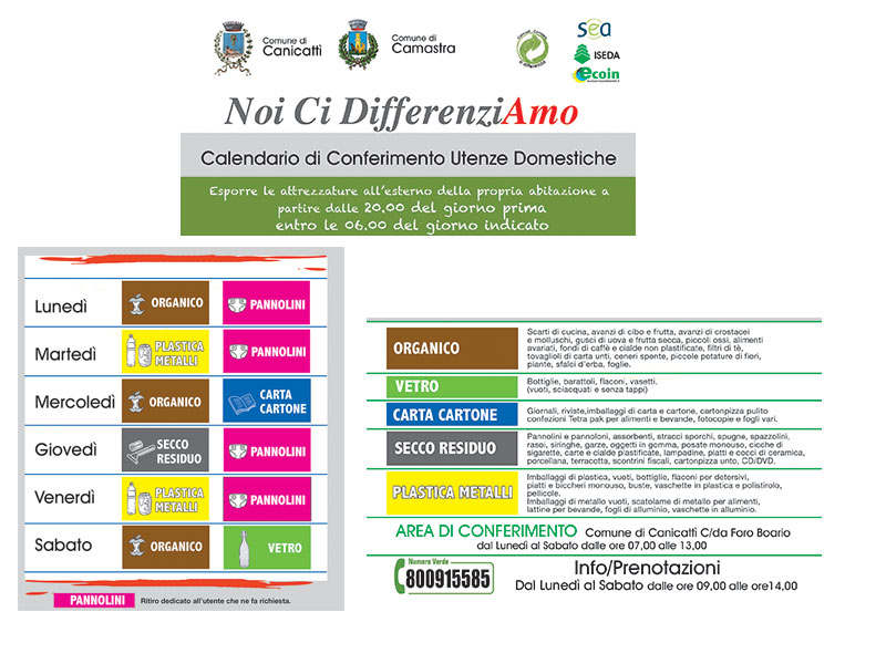 Continua a Canicattì e Camastra, la distribuzione dei mastelli per la raccolta differenziata che prenderà ufficialmente il via il prossimo mese di febbraio. A Canicattì, sono aperti tutti i giorni, gli sportelli del centro culturale “San Domenico di Canicattì, dove vengono consegnati oltre ai mastelli, anche i materiale informativo predisposto dai Comuni di Canicattì e Camastra e dalle imprese Sea, Iseda ed Ecoin che hanno in appalto, per 7 anni, il servizio. Intanto, i cittadini possono cominciare a prendere visione anche del calendario di conferimento per le utenze domestiche che prevede il lunedì, il mercoledì e il sabato l’organico, composto, fra l’altro, da scarti di cucina, avanti di cibo e frutta, fondi di caffè, cialde non plastificate, filtri da the, piccole potature di fiori. Il martedì e il venerdì saranno raccolti i mastelli gialli per plastica e metalli compreso l’alluminio mentre la carta e il cartone nel mastello blu, saranno raccolti il mercoledì. Per il vetro nel mastello verde scuro il giorno fissato è il sabato mentre per il secco residuo o indifferenziato, i cittadini potranno esporre il mastello grigio il giovedì. Discorso a parte per i pannolini per la cui raccolta sono stati fissati 4 giorni che sono il lunedì, il martedì il giovedì ed il venerdì. In questo specifico caso, si dovrà fare un’apposita richiesta al Comune o agli uffici dove si ritira il materiale per il porta a porta in modo da avere un preciso indirizzo e precise disposioni per questo genere di rifiuto. Fino a quando non sarà terminata la distribuzione a tutte le utenze censite, i cittadini di Canicattì, potranno continuare a rivolgersi al personale specializzato presso il centro culturale “San Domenico” dal lunedì al venerdì dalle 9 alle 13 e dalle 15 alle 17.30 e il sabato dalle 8.30 alle 14. Il calendario fissato per evitare lunghe code e tempi di attesa agli sportelli, prevede che gli utenti i cui cognomi iniziano le lettere A, B e C potranno andare fino a venerdì prossimo, 11 gennaio. Le lettere D, E, F e G da sabato 12 a sabato 19 gennaio. Le lettere H, I, J, K ed L saranno servite da lunedì 21 a sabato 26 gennaio, le lettere M, N, O e P da lunedì 28 a sabato 2 febbraio e le rimanenti lettere da lunedì 4 a sabato 9 febbraio. Per il ritiro gratuito dei mastelli e di tutto il materiale informativo, sarà necessario avere con se la tessera sanitaria dell’intestatario della Tari anche in caso di delega. A Camastra, la distribuzione di tutto il materiale necessario per effettuare il porta a porta, continuerà fino a quando non saranno servite tutte le utenze domestiche. L’ufficio apposito, è stato allestito al Centro sociale di Corso Vittorio Veneto che rimarrà aperto dal lunedì al venerdì dalle 9 alle 13 e dalle 15 alle 17.30 ed il sabato dalle 8.30 alle 14. In questo caso, essendo la popolazione di Camastra inferiore per numero a quella di Canicattì, non è necessario attenersi a specifici turni. Sarà sufficiente recarsi al centro sociale negli orari fissati con la Tessera sanitaria dell’intestatario della Tari.