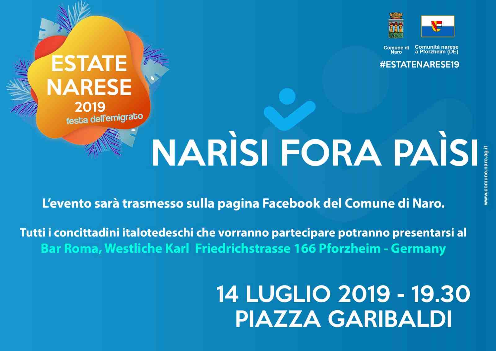 La serata si intitolerà “Narisi fora paisi”, ci sarà un collegamento in diretta streaming con la grande comunità narese in Germania e l’iniziativa sarà trasmetta live sulla pagina Facebook ufficiale del comune di Naro.