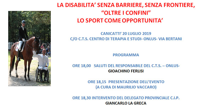 Sabato, 20 luglio 2019, si terrà presso i locali del C.T.S. Centro di Terapia e Studi-ONLUA l’Evento “La disabilità senza barriere, senza frontiere, oltre i confini- Lo sport come opportunità.