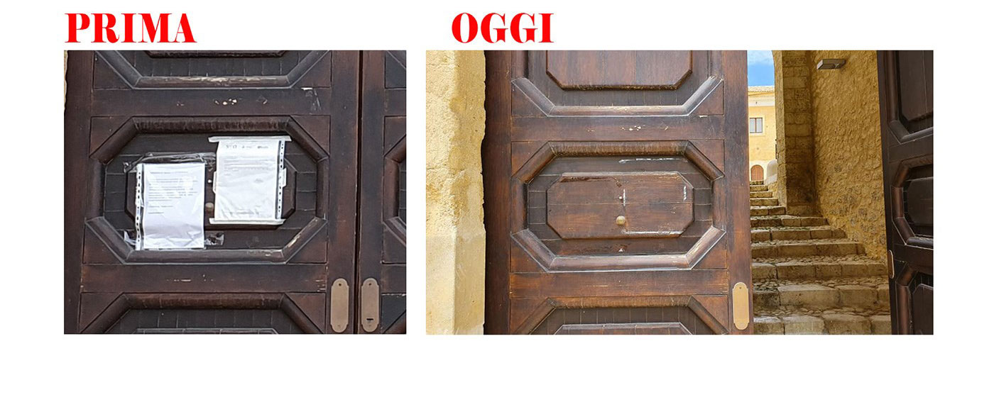 Quando oggi mi hanno inviato queste foto , non sono neanche riuscito a meravigliarmi. Quello che vedete è il portone, il prezioso portone del San Domenico centro culturale utilizzato fino a poco tempo fa alla distribuzione dei mastelli della monnezza.