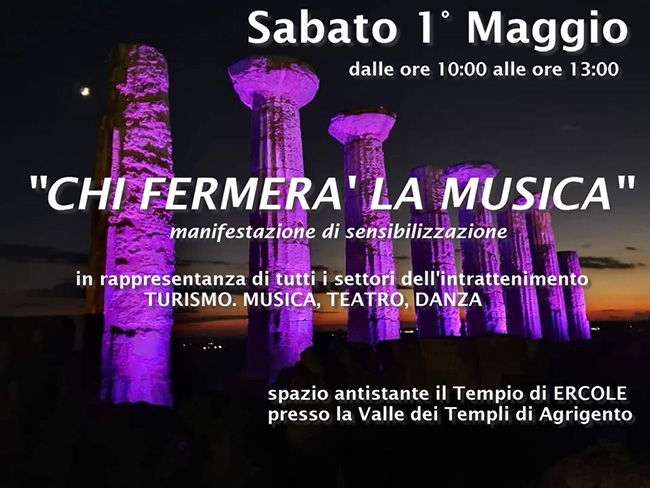 Il 1 maggio 2021 – dalle ore 10:00 alle ore 13:00 – nello lo spazio antistante il Tempio di ERCOLE presso la Valle dei Templi di Agrigento, avrà luogo “Chi fermerà la Musica”, una manifestazione già autorizzata in rappresentanza di tutti i settori dell’intrattenimento (TURISMO, MUSICA, TEATRO, DANZA…).