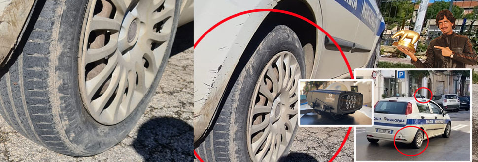 Proprio così. Quella che vedete nella foto è una delle tante auto in dotazione ai nostri vigili urbani, anzi è proprio l’auto che s9i vede nel servizio televisivo che porta in giro lo street control . Il primo piano delle gomme dell’auto ( foto di questa mattina), non lascia dubbi. Sono quasi “ a tela” come direbbe il vostro gommista di fiducia.