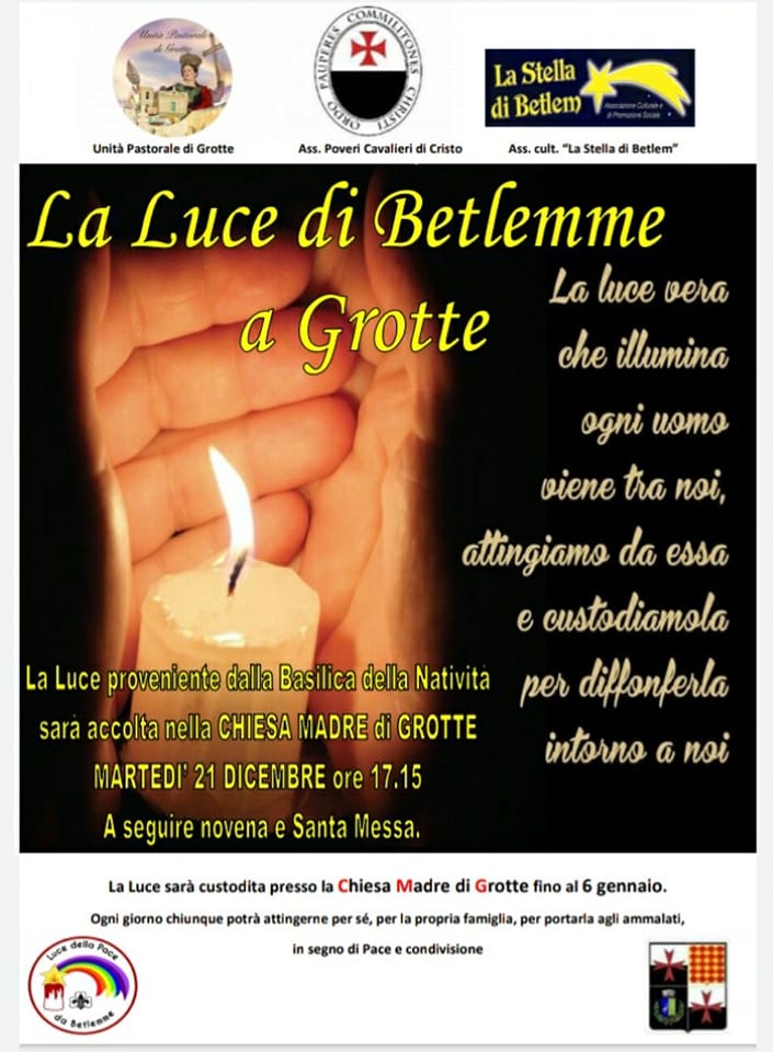 La Luce di Betlemme sarà custodita nella Chiesa Madre di Grotte fino al 6 gennaio e tutti i giorni i fedeli potranno attingerne portando un lumino per condurla in famiglia, agli ammalati, alle persone sole e per diffonderla a più gente possibile, in segno di pace.