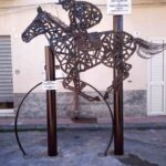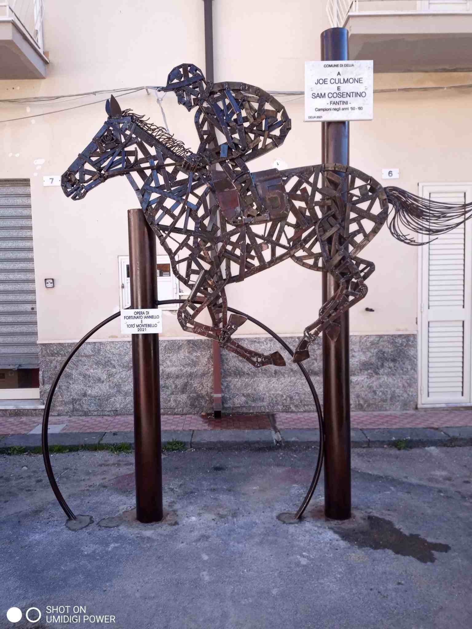 Un fantino mentre monta un cavallo in corsa in ricordo dei fantini di origine deliana, Joe Culmone e Sam Cosentino, campioni, negli Stati Uniti e in Canada, nello sport delle corse di cavalli purosangue negli anni ’50 e ’60: la scultura in ferro è stata donata dall’artista Totò Montebello e dall’artigiano Fortunato Iannello a Delia.