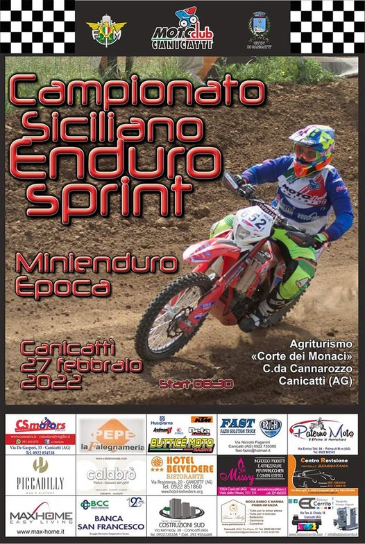Domenica 27 Febbraio riparte da Canicattì l’attività agonistica FMI con la prima gara di Campionato Endurosprint & Minienduro insieme al Trofeo Regolarità, organizzata dal Motoclub Canicattì.