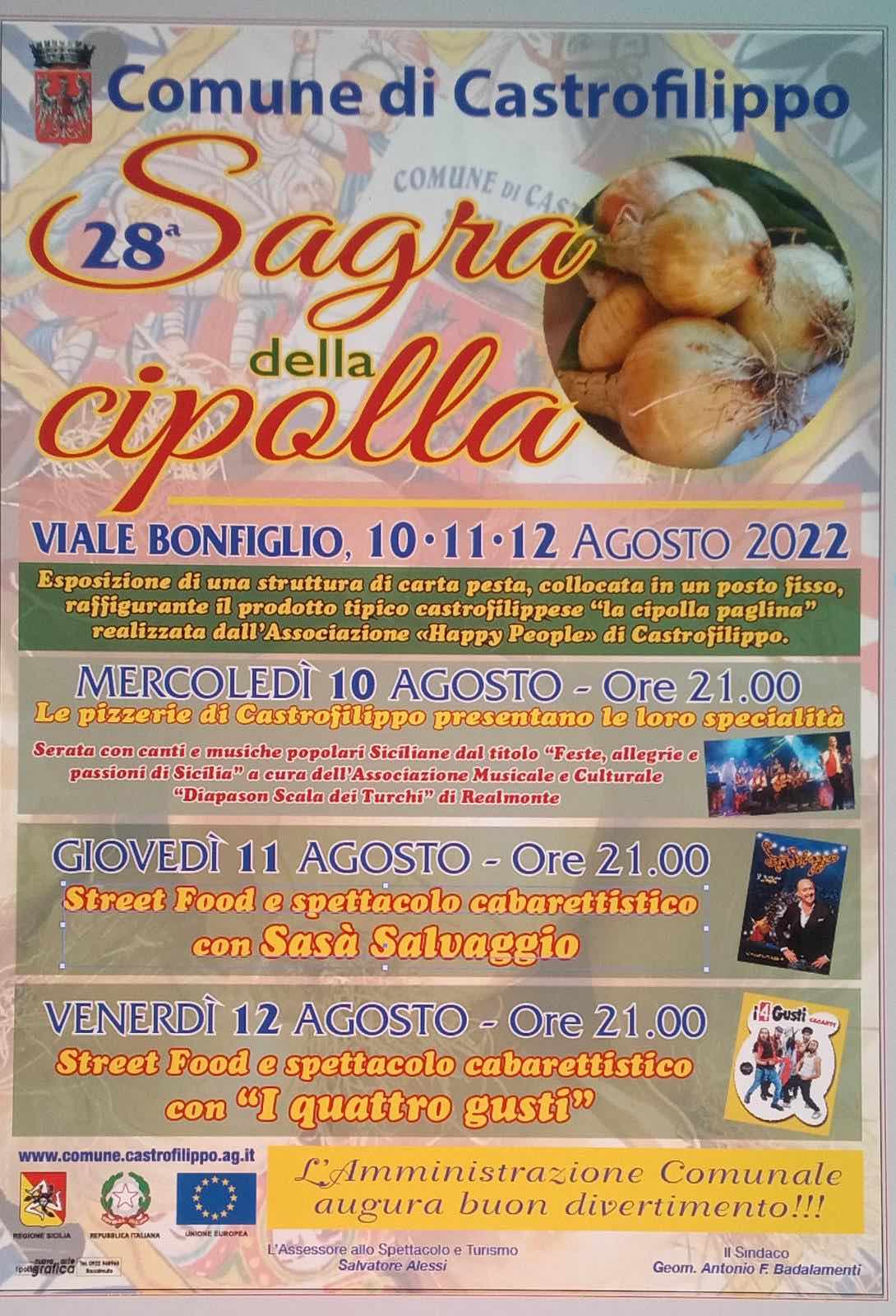 Torna a Castrofilippo, dopo lo stop dovuto alla pandemia Covid 19, la “Sagra della Cipolla” giunta quest’anno alla sua 28° edizione. Una tre giorni, il 10, 11 e 12 agosto, che si svolgerà tra degustazioni e momenti di spettacolo per celebrare il prodotto tipico castrofilippese presidio “Slow Food”. Per l’occasione, piatti tipici a base di cipolla Paglina saranno preparati dai ristoratori e dalle pizzerie di Castrofilippo e verranno distribuiti negli appositi stand per essere assaggiati dai visitatori. Questo il programma completo della tre giorni: mercoledì 10 agosto alle 21, i ristoratori di Castrofilippo presenteranno le loro specialità a base di cipolla nel corso di una serata con canti e musiche popolari siciliane dal titolo “Festa allegria e passioni di Sicilia” a cura dell’associazione culturale Diapason Scala dei Turchi di Realmonte. Giovedì 11 agosto ore 21, Street Food e spettacolo cabarettistico con Sasà Salvaggio. Venerdì 12 agosto, Street Food e spettacolo cabarettistico con “I Quattro Gusti”. Centro delle iniziativa sarà il viale Bonfiglio. Durante la Sagra della Cipolla ci sarà, inoltre, l’esposizione di una struttura realizzata in carta pesta che raffigura il prodotto tipico castrofilippese realizzata dall’associazione “Happy People” di Castrofilippo. “Auspichiamo- dichiarano il sindaco Franco Badalamenti e l’assessore allo sport, turismo e spettacolo Salvatore Alessi- la partecipazione di tanti visitatori in questi tre giorni di iniziative dedicate alla nostra cipolla che ha raggiunto le tavole di milioni di italiani e viene usata in cucina da chef di fama internazionale. Saranno tre giorni, intensi, ricchi di iniziative e di buona cucina- concludono Badalamenti e Alessi- che vogliamo condividere con quanti ci onoreranno della loro partecipazione”.