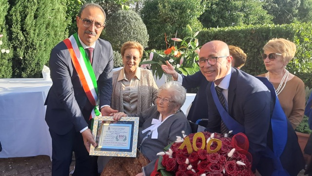 Grande festa ieri pomeriggio a Castrofilippo per i 100 anni della signora Francesca Graci. Prima di andare in pensione, insieme al marito Giuseppe Graci scomparso nel 1997, ha svolto il lavoro di bidella nella scuola media del piccolo centro agrigentino ed ha visto crescere intere generazioni. Ieri, per nonna Francesca è stata una duplice festa compleanno ed onomastico insieme. Erano presenti i sette figli: Giuseppina, Maria, Salvatore, Antonella, Rosanna, Letizia e Giacomo insieme ai nipoti ed ai pronipoti dell’anziana. L’amministrazione comunale, in occasione dell’evento ha donato alla signora Francesca Graci un mazzo di rose ed una targa ricordo consegnati dal sindaco Franco Badalamenti e dal Presidente del consiglio comunale Salvatore Graci nipote della centenaria. Presenti anche altri esponenti della giunta e del consiglio comunale.“ Alla signora Francesca Graci- ha detto il sindaco Franco Badalamenti- vanno gli auguri di tutta la comunità castrofilippese. Si tratta di un giorno speciale –ha concluso il sindaco di Castrofilippo- perché tutti noi dobbiamo essere grati a chi, con le proprie esperienze personali e con i propri insegnamenti, ha contribuito alla crescita sana della nostra società. Da parte dell’amministrazione comunale alla signora Francesca Graci vanno i più sinceri auguri per questo importante traguardo raggiunto”.