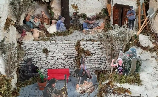 Non c’è il cielo stellato con la cometa ma la scia luminosa di un bombardamento a Gaza; al posto dei pastori alcune sagome di militari e civili, tratte dalle più celebri fotografie dei più recenti scenari di guerra (Siria, Ucraina, Palestina, Yemen..)