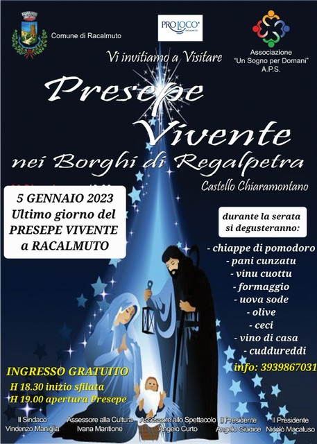 5 GENNAIO 2023 Ultimo giorno del PRESEPE VIVENTE a RACALMUTO, durante la serata si degusteranno: