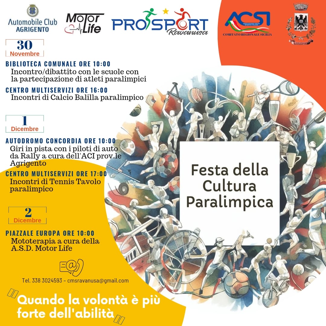 Tutto pronto a Ravanusa per la tre giorni dedicati alla sensibilizzazione della Cultura Paralimpica, la manifestazione promossa dalla Pro Sport Ravanusa di svolgerà dalla giornata di Giovedì 30 Novembre a Sabato 2 Gennaio, l’iniziativa inoltre gode della collaborazione della delegazione dell’ACI di Agrigento, della Motor Life, del Comune di Ravanusa, e dal Comitato Regionale dell’ACSI Sicilia.