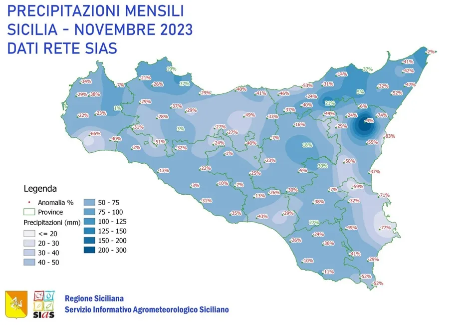 La maggioranza delle stazioni Sias ha registrato accumuli mensili compresi tra 40 e 90 millimetri. Mettendo per il momento da parte i 146 millimetri della stazione Linguaglossa Etna Nord registrati il 23 novembre, il massimo accumulo giornaliero risulta rilevato dalla stazione Ramacca Giumarra lo stesso giorno con 51,2 millimetri. Questo in seguito ad un nubifragio causato da una cella temporalesca in transito. Il massimo numero di giorni piovosi, pari a 13, è stato registrato da diverse stazioni del settore tirrenico, mentre il più basso numero, 3, è stato registrato dalla stazioni Catania e Siracusa sul settore ionico.