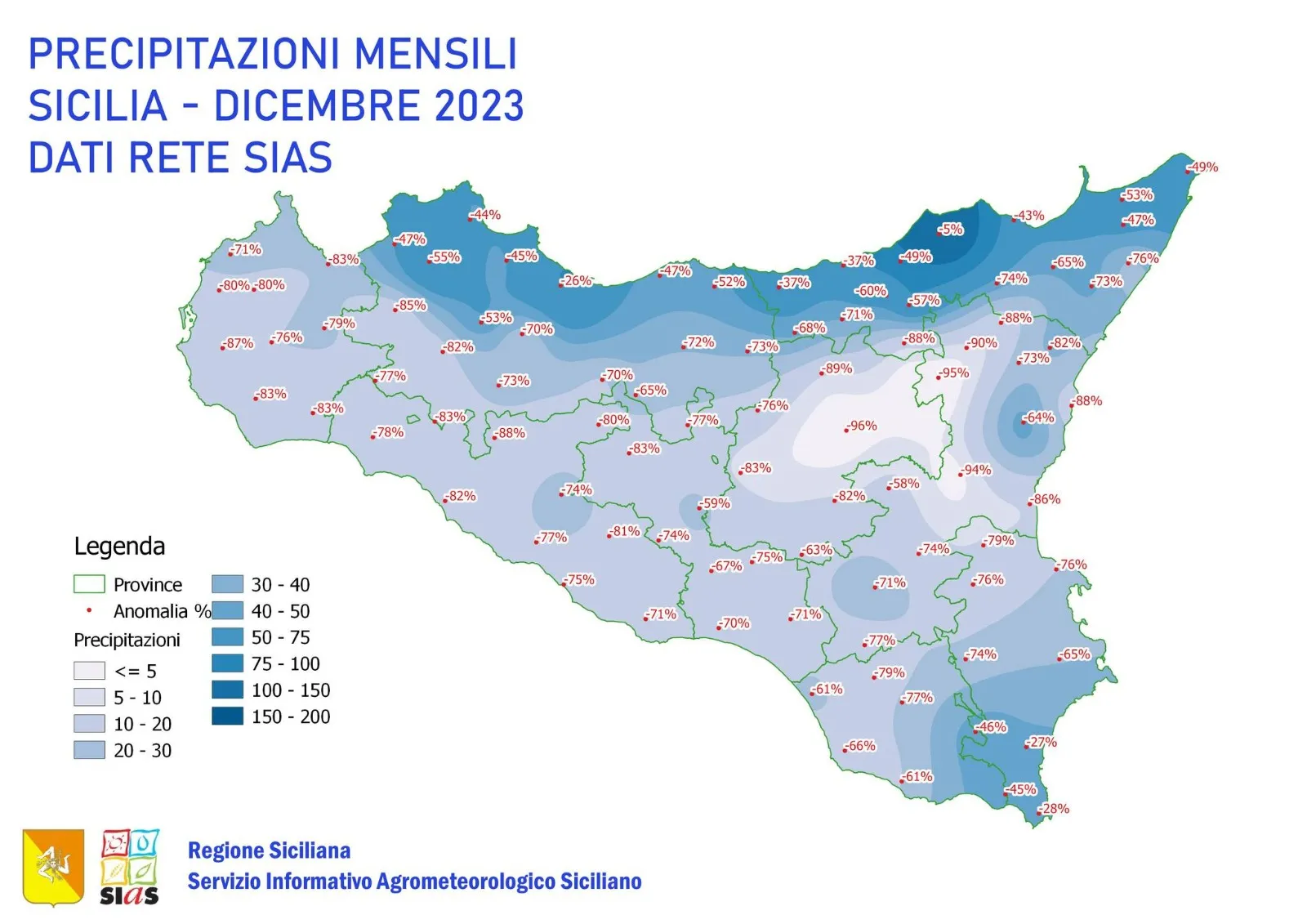 “Il mese di dicembre ha fatto registrare per il quarto mese consecutivo pesanti deficit negli accumuli pluviometrici, determinando una situazione per alcuni versi del tutto inedita, anche a confronto con i gravi periodi di siccità degli anni ’70 e ’80 e con quello del 2002. Secondo l’analisi delle serie degli annali idrologici, mai infatti in Sicilia dal 1921 le precipitazioni erano state così scarse nel secondo semestre dell’anno, risultando, come media regionale, inferiori anche a quelle della grave siccità del 1977. Se attualmente il deficit non risulta così grave nei bilanci pluviometrici a medio termine, è solo grazie alle anomale piogge dei mesi di maggio e giugno, i cui eccessi tuttavia più che apportare benefici determinarono danni significativi a diverse colture”.