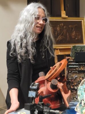 Ogniqualvolta Silvia riunisce su qualche tavolo tutte le sue sculture-assemblages, le accumula in uno spazio ristretto: si toccano tra di loro confondendo metalli, legni e chissà cosa in un tutt’uno somigliante ad una città fantastica, fantasmagorica nella sua minituarizzazione neo gotica. No nemmeno, forse una neo “Metropoli”…non so… comunque soffocante.