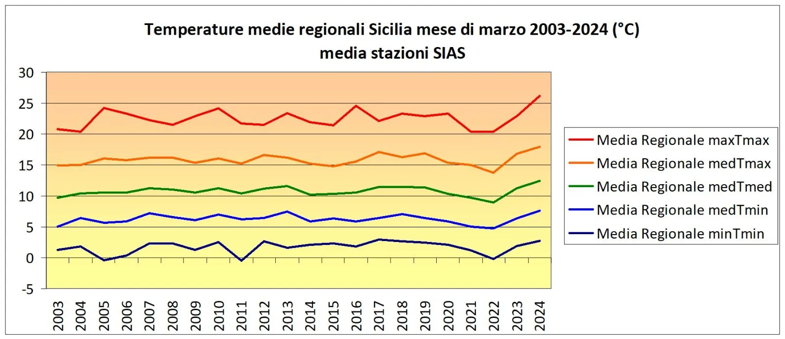 Arrivano le cifre che confermano quanto si è percepito in questi giorni. Il mese di marzo da poco concluso ha prolungato in Sicilia la serie di mesi con valori termici superiori alla norma, arrivata ormai al settimo mese consecutivo. “Non è stato il mese di marzo più caldo in assoluto della storia meteorologica della Sicilia, superato abbondantemente, a un primo esame, da un 2001 che raggiunse la temperatura media regionale di 14,7 °C, poi dal 1991 e dal 2002, tuttavia la media regionale stimata sulla rete Sias di 12,4 °C risulta essere la più alta dal 2003 – dicono i tecnici del servizio informativo agrometeorologico siciliano -, I prolungati periodi con cieli sereni hanno favorito elevate escursioni termiche notturne, così che le anomalie per le temperature massime sono molto più rilevanti di quelle per le temperature minime”.