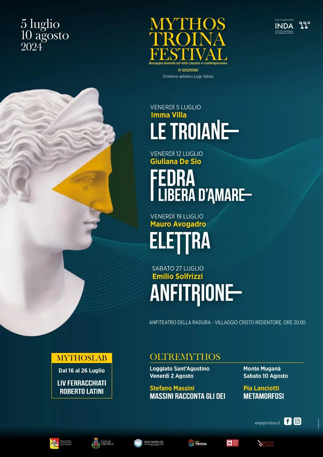 Oltre un mese di eventi caratterizzeranno il ricco e prestigioso cartellone firmato dall’attore Luigi Tabita, al suo primo anno da Direttore artistico del Mythos Troina Festival, che presenta così la rassegna: “Sono felice ed emozionato di presentare questa mia prima edizione del MTF. Le scelte programmatiche che ho compiuto hanno tutte un forte carattere di impegno civile, colonna portante del mio percorso sia artistico che umano. Il Mito, file rouge della rassegna, con la sua forza di trascendere il tempo e lo spazio, si fa per questa edizione cantore della complessità contemporanea narrando la guerra, la violenza dell’amore, l’emigrazione, l’alterità, i corpi in trasformazione e in lotta. Tutti gli appuntamenti avranno come unica cornice un luogo magico e fuori dal tempo com’è Troina, antica città ellenistica e prima capitale normanna di Sicilia” conclude il Direttore artistico.