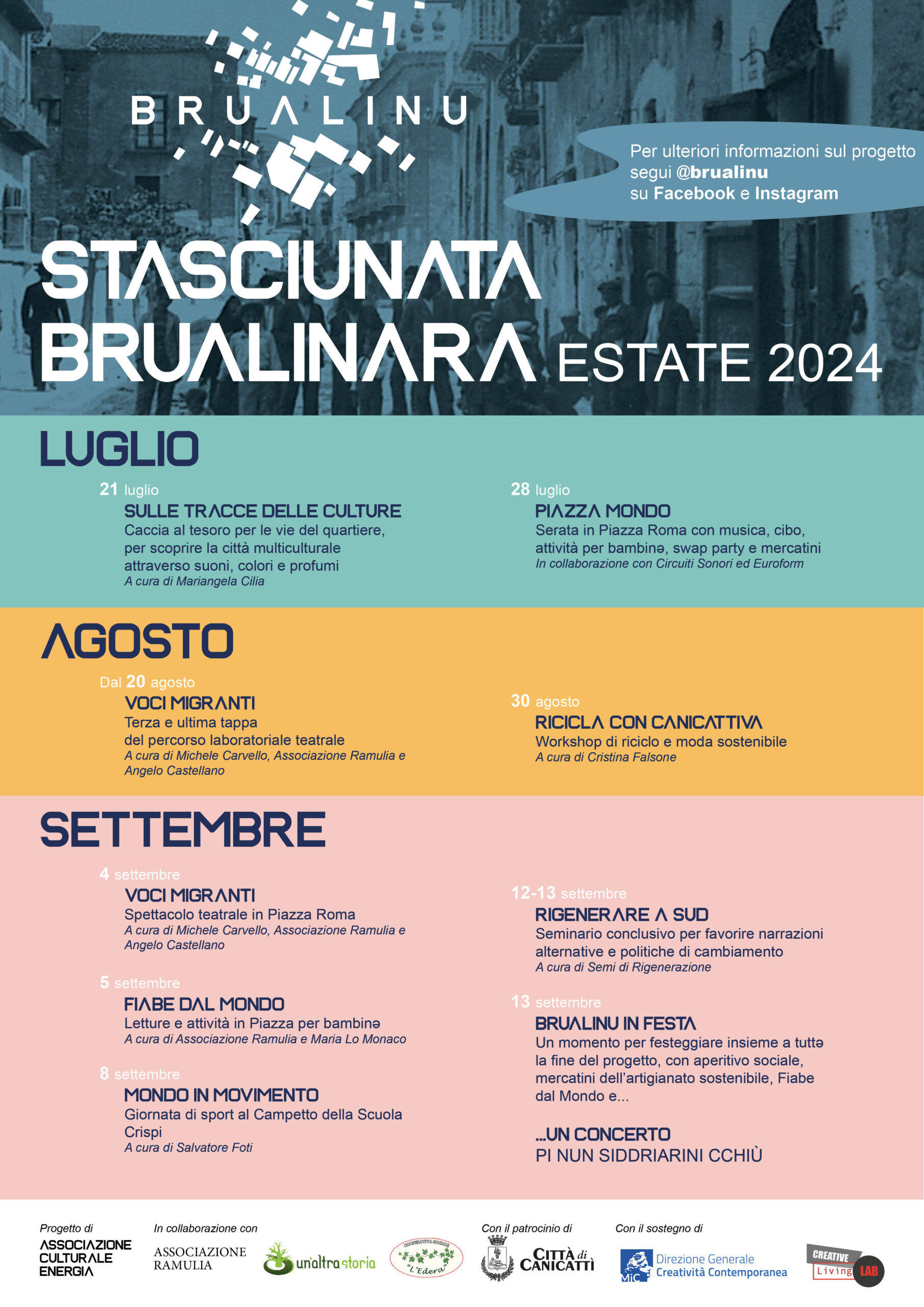 All’interno del progetto BRUalinu – Benessere e Rigenerazione Urbana, uno dei 28 vincitori della V edizione del Creative Living Lab, promosso dalla Direzione Generale Creatività Contemporanea del Ministero della Cultura, l’ultimo trimestre sarà dedicato alle attività estive, da luglio a settembre, per ri-tornare a Brualinu, alle origini della nostra città, e valorizzare spazi, luoghi, attività, persone e vissuti.