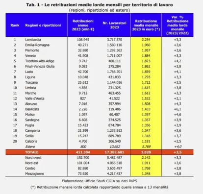 Nel 2023 monte salari da 411 miliardi. La Sicilia al diciannovesimo posto per retribuzione lorda mensile