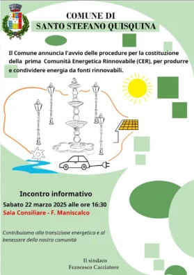 Il Comune di Santo Stefano Quisquina dà il via al percorso per attivare la CER Comunità Energetica Rinnovabile promuovendo l’uso dell’energia da fonti rinnovabili: un progetto impegnativo per offrire al territorio un nuovo modello di sviluppo sostenibile attraverso l’autoproduzione energetica da fonti rinnovabili. La comunità solidale di produttori e consumatori potrà condividere energia verde, con un risparmio tangibile per cittadini e imprese e a vantaggio dell’ambiente e in termini concreti, si favoriscono benefici economici per i cittadini consumatori e produttori di energia.