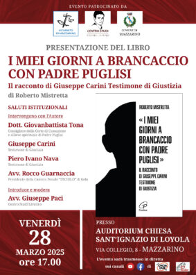 Si terrà venerdì prossimo a Mazzarino in provincia di Caltanissetta la presentazione del libro dal titolo “I miei giorni a Brancaccio con padre Puglisi” il racconto di Giuseppe Carini testimone di Giustizia scritto dal giornalista Roberto Mistretta. L’incontro si terrà con inizio alle 17 presso l’auditorium della chiesa Sant’Ignazio di Loyola. Per la prima volta interverranno (da remoto) due testimoni di giustizia che vivono sotto falso nome, ovvero Piero Ivano Nava, il supertestimone che identificò i carnefici del giudice Rosario Livatino, e Giuseppe Carini, presidente dell’associazione Testimoni di giustizia, che fu validissimo collaboratore di padre Pino Puglisi. Saranno presenti inoltre. Giovanbattista Tona consigliere della Corte di Cassazione, l’avvocato Rocco Guarnaccia presidente della camera penale di Gela. Gli interventi saranno moderati dall’avvocato Giuseppe Paci del centro studi Livatino