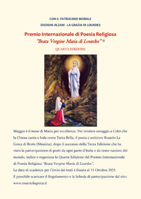Maggio è il mese di Maria per eccellenza. Per rendere omaggio a Colei che la Chiesa canta e loda come Tutta Bella, il poeta e scrittore Rosario La Greca di Brolo (Messina), dopo il successo della Terza Edizione che ha visto la partecipazione di poeti da ogni parte d’Italia e da tante nazioni del mondo, indice e organizza la Quarta Edizione del Premio Internazionale di Poesia Religiosa “Beata Vergine Maria di Lourdes”. Il Premio, per scelta, non gode di nessun contributo pubblico e privato e si avvale del Patrocinio Morale delle Edizioni Alzani – La Grazia di Lourdes di Pinerolo (Torino), ha cadenza biennale e si articola in 2 Sezioni: Sezione A: Poesia in lingua italiana a tema religioso; Sezione B: Poesia in lingua italiana a tema libero. Premi: i primi tre classificati e i Premi Speciali della Giuria di ogni Sezione riceveranno eleganti targhe in flex, sono previsti anche Diplomi personalizzati alle Menzioni e Segnalazioni assegnate ad autori di opere ritenute meritevoli. Inoltre, sarà conferito dal Presidente della Giuria, un Premio Speciale alla memoria di Silvia Ragazzini Martelli di Sissa Trecasali (Parma), poetessa, scrittrice, pittrice, infaticabile organizzatrice culturale, immaturamente scomparsa il 24 Settembre 2022 all’età di 68 anni. Le opere saranno giudicate da una Giuria presieduta dal Fondatore e Presidente del Premio, poeta e scrittore Rosario La Greca e composta da qualificati esperti, il cui giudizio è inappellabile ed insindacabile. Verranno assegnati anche 2 Riconoscimenti Internazionali a Personalità e Associazioni che si sono distinte nel campo della Solidarietà e del Volontariato. La data di scadenza per l’invio dei testi è fissata al 31 Ottobre 2025. È possibile scaricare il Regolamento e la Scheda di partecipazione dal sito: www.rosariolagreca.it