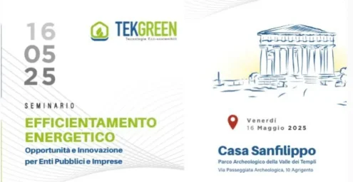 Ad Agrigento il 16 maggio alle ore 9,30 si svolgerà a Casa Sanfilippo presso la sede del Parco Archeologico di Agrigento un importante seminario dal titolo “Efficientamento energetico. Opportunità e Innovazione per Enti Pubblici e Imprese”, promosso dalla Tekgreen srl in collaborazione con Unical e Bio Wood Heater, con il patrocino del Parco Archeologico Valle dei Templi e il Comune di Agrigento.