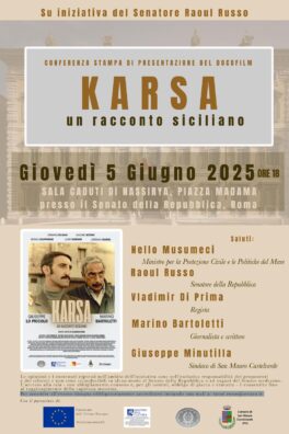 Giovedì 5 giugno 2025, alle ore 18.00, la Sala Caduti di Nassirya, a Palazzo Madama, ospiterà la presentazione del docufilm “KARSA – Un racconto siciliano”. L’iniziativa, promossa dal Senatore Raoul Russo, rappresenta un’occasione per riportare al centro del dibattito pubblico una Sicilia vera, profonda, fatta di volti, storie e tradizioni troppo spesso dimenticate.