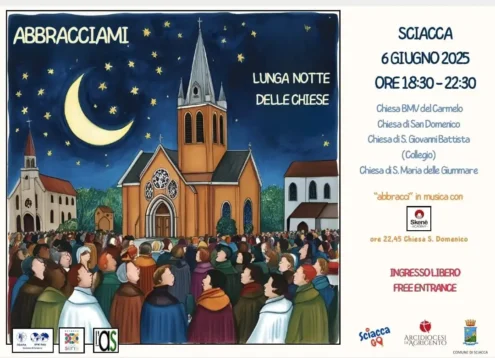 Quest’anno, venerdì 6 giugno 2025, per il secondo anno consecutivo, anche Sciacca si unirà a questa straordinaria iniziativa, aprendo dalle 18,30 alle 22,30 le porte di quattro tra le sue chiese più belle e significative: la Chiesa del Carmine, la Chiesa del Collegio, la Chiesa di San Domenico e la Chiesa delle Giummare.
