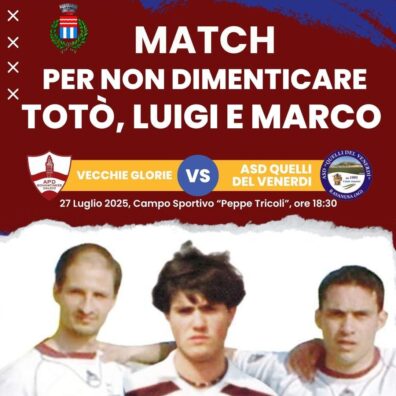 In attesa dei prossimi appuntamenti, la giornata di domenica 27 luglio si preannuncia ricca di emozioni. Perché il calcio, quando si intreccia con la memoria e l’amicizia, riesce a diventare qualcosa di molto più grande di una semplice partita. Un modo per dire, con il cuore, che Totò, Luigi e Marco sono ancora con noi – nel ricordo, nel gioco, nella vita condivisa.