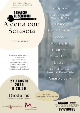Secondo appuntamento con “A cena con Sciascia”, con un menu realizzato grazie alla consulenza scientifica del nipote dello scrittore, Vito Catalano, che ha suggerito gusti e preferenze del grande racalmutese. Le letture saranno affidate alla voce dell’attrice Annagrazia Montalbano che guiderà il pubblico tra brani di romanzi, novelle e due bellissime poesie con le quali Sciascia esordì come scrittore.