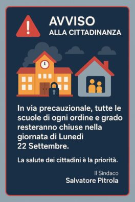 Il Sindaco di Ravanusa, Salvatore Pitrola, ha emesso un comunicato urgente per informare la cittadinanza e adottare misure precauzionali. In particolare, ha disposto la chiusura delle scuole per la giornata di lunedì 22 settembre 2025. Di seguito il testo dell’avviso: